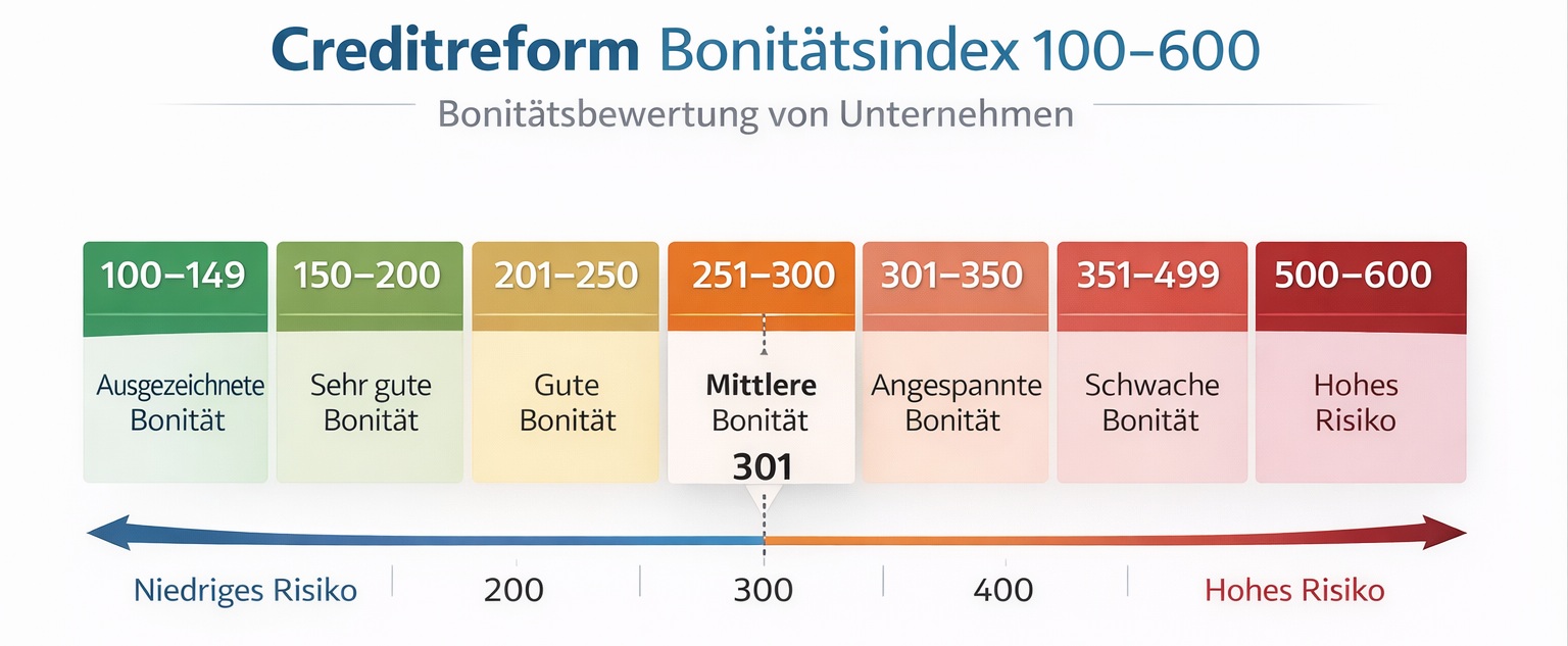 Eine Übersicht über die gesamte Skala von 100 bis 600 sowie die Bedeutung einzelner Schwellenwerte finden Sie im Beitrag „Creditreform Bonitätsindex 100–600 erklärt“.
